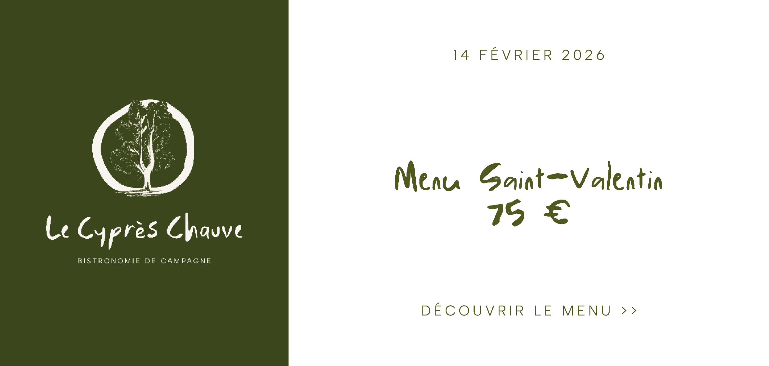 Comme notre carte de restaurant – renouvelée tous les 15 jours – le Cyprès Chauve varie selon les saisons, vert aux belles saisons parés de ses feuilles et fruits, brun rouge flamboyant à l’automne et nu en hiver ; seul conifère à perdre son feuillage, il laisse apparaître sa forme instrumentale unique.