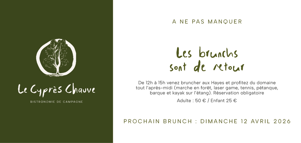 Le Cyprès chauve est un tout jeune restaurant créé au sein des Hayes, domaine plein de mémoire, nouvellement restauré. Lieu d’instants culinaires conviviaux dans un écrin de nature, Cyprien vous y fait découvrir sa cuisine chaleureuse et goûteuse.